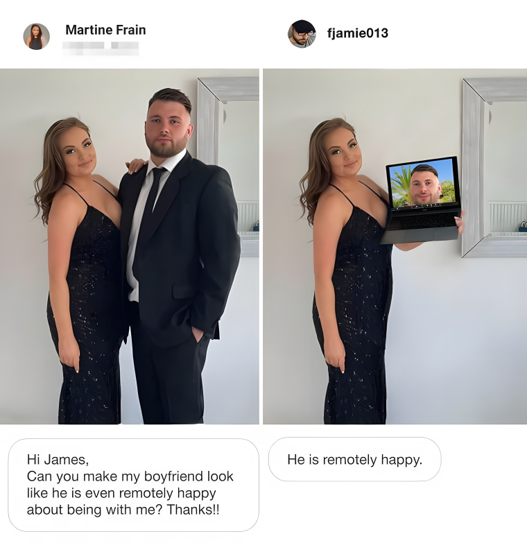 A lot of people have been in this same exact spot. The girl in this photo wasn’t very happy that her boyfriend didn’t want to smile for the camera. So, she asked that he be made to “look remotely happy about being with me.” The photo she got back had her holding a laptop with her boyfriend tuning in remotely from what looks like a tropical island or something.