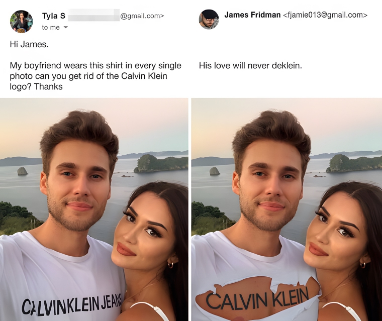 This photo was sent in by a girlfriend who was complaining that her boyfriend constantly wore the same shirt in all of their photos. And honestly, who can blame him? We all have that one t-shirt we love to wear all the time. Anyway, she asked for the Calvin Klein logo to be taken off the shirt. The photoshopped image shows the boyfriend without his favorite shirt but with a tattoo sporting the name of his favorite brand.
