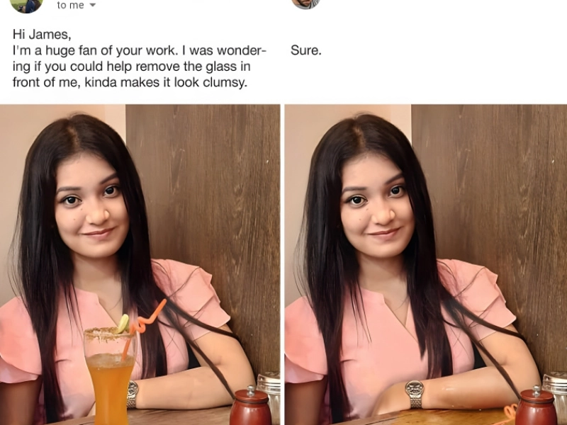This girl thought so and asked for it to be taken totally off the picture; we’re not sure why a glass that’s just resting on the table in front of you would make you look clumsy. The glass was taken out, but in the second picture she doesn’t really look any less awkward. She most certainly spilt her drink. The picture on the right shows even her arm damp.