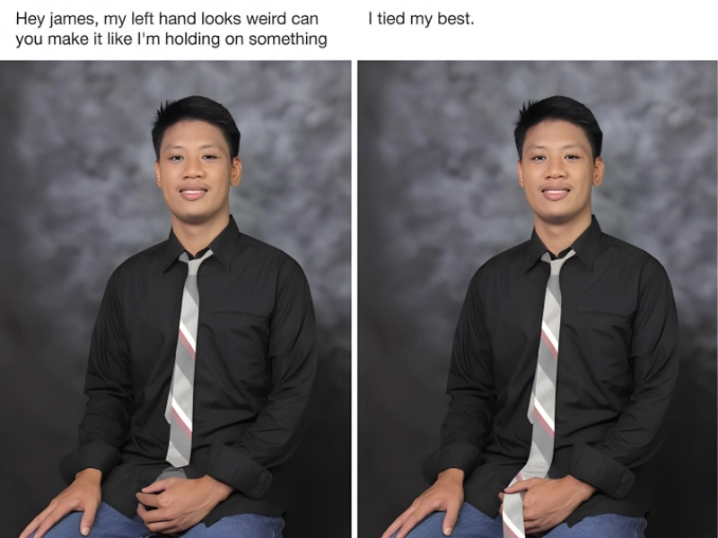 More embarrassing than this guy’s hand in the left photo? Yes, his hand is seen on the right side of the picture. He essentially begged for his left hand to grip something and look less weird. Though it doesn’t look much less weird, it is clutching something in the picture on the right. If anything, we find it difficult to truly turn away from it now. At least with the first picture, there was a chance you might overlook it.