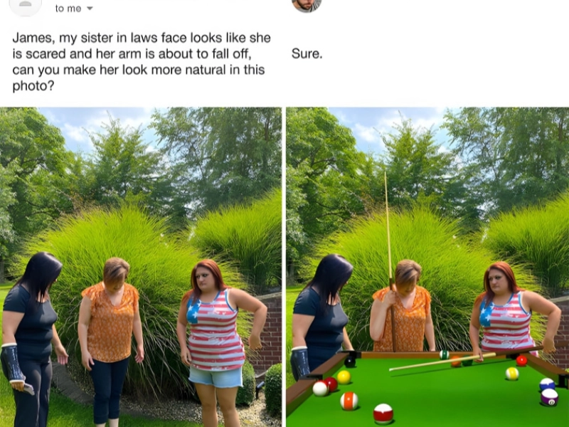 While candid pictures might be fantastic occasionally, most of the time people are simply acting in a little odd manner when photographed in still form. The sister-in–law of this lady happened to be moving her arm when this picture was taken, and it looked really odd. She requested that something be done regarding her sister in laws arm to give it more natural appeal. As you can see, though, adding a pool stick and table was the only way to make that look more genuine.
