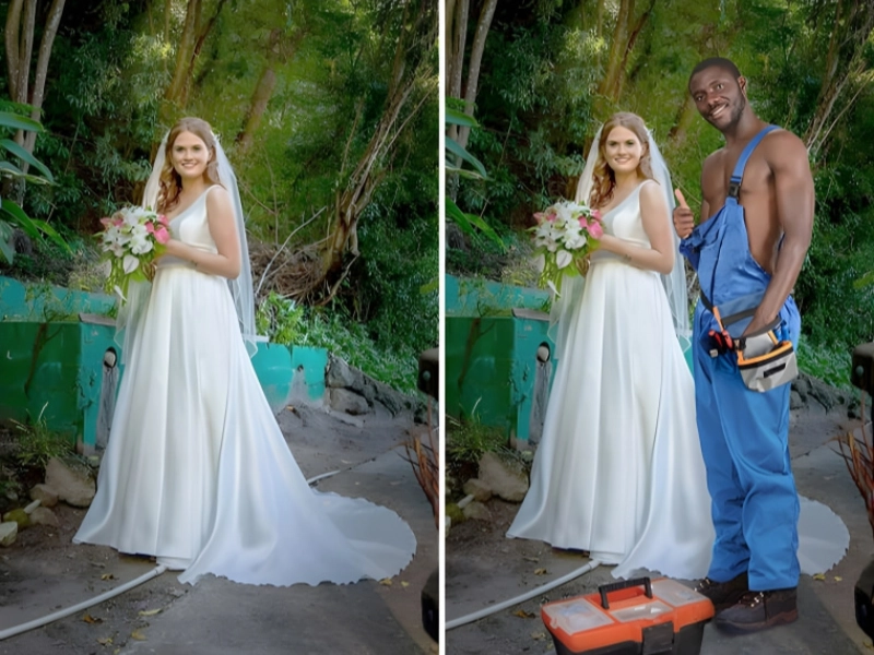 This bride-to- be had pictures shot near the edge of a building site for whatever reason. Strange green walls and an odd pipe flowing across the earth abound. She requested the pipe to be taken off since it seemed so out of place. The man who altered this picture just added a plumber to make the pipe seem more “natural,” instead of eliminating it.