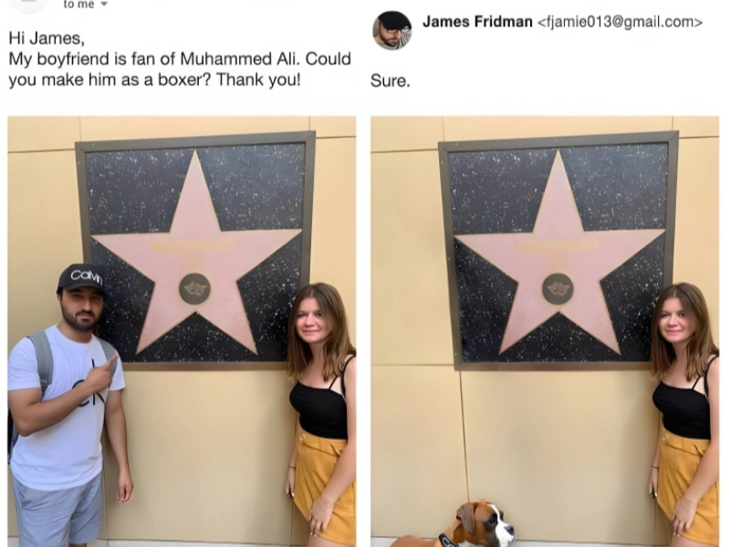 Extremely devoted to Muhammid Ali, the man in the picture on the left and his fiancée visited his star at the Hollywood Walk of Fame. His fiancée so wanted to do something pleasant and inquired whether he might be trained as a boxer. She clearly wasn’t referring to the dog above, although the picture on the right technically isn’t totally incorrect.