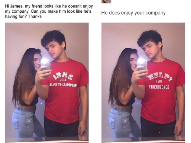 This one is so fantastic that initially it’s quite difficult to tell these two images apart. This girl asked that her companion be made to seem as though he was having fun as she felt he didn’t look like he was enjoying their time together. Though the alteration here is still funny, this is most likely the only one on the list that doesn’t get precisely fulfilled in some form.
