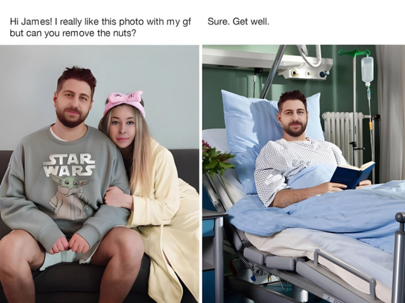 The man in this picture wrote in a request asking that the left-leaning photo’s nuts be taken out. Given the overall picture seems a bit weird and the two of them appear to have just awakened up, we’re not exactly sure why. He fulfilled his wish, nevertheless, and ended up in the picture on the right post-operative. We can only hypothesise about the type of surgery he was supposed to be recuperating from.