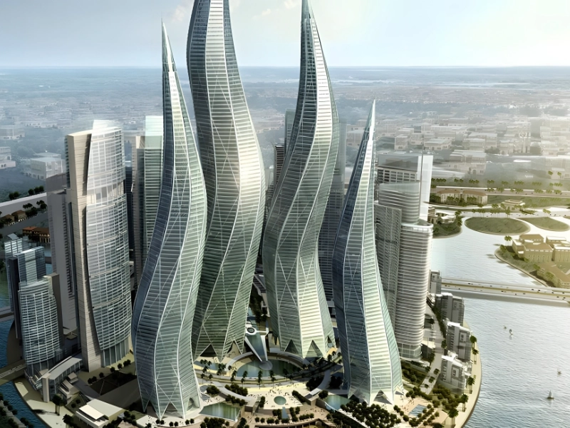 The Dubai Towers were designed by developer Sama Dubai to be the focal point of “The Lagoons,” another shelved megaproject in Dubai that was to be comprised of seven islands, and to enhance the already distinctive appearance of the Dubai downtown.