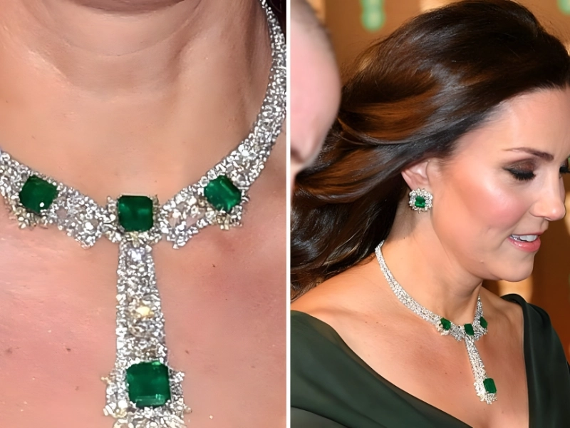 Value Approximation: $2.5 Million* Kate has a great ability to draw attention. She looked like a million bucks when she attended the 71st BAFTAs with Prince William back in 2018. Naturally, Kate accessorized her green gown with a matching necklace and stunning diamond drop earrings set with large emeralds.