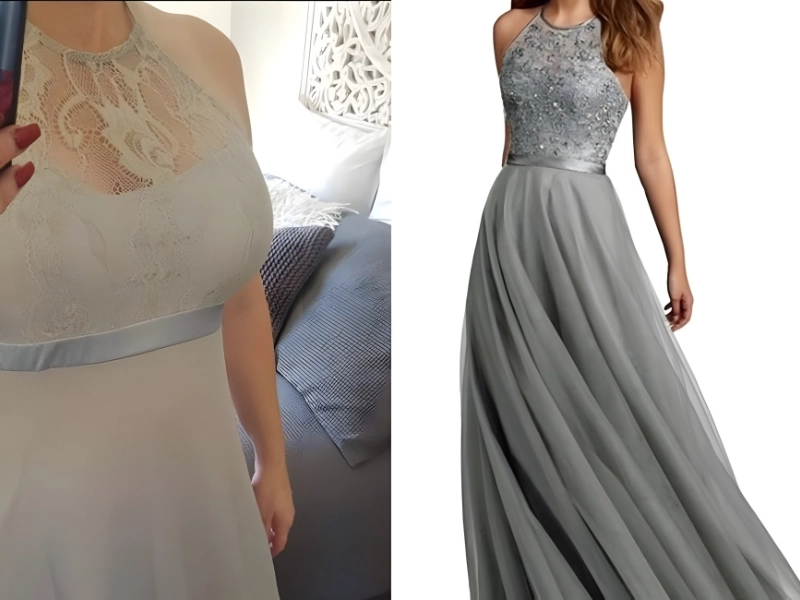 All things considered, this could have been much, far worse. Does the imitation dress resemble the original in any way? Naturally not, but it’s not completely unsightly. It’s simply extremely distinct. The supplied goods appears to be a pale beige with a contrasting waist design, when the original is a smokey gray.