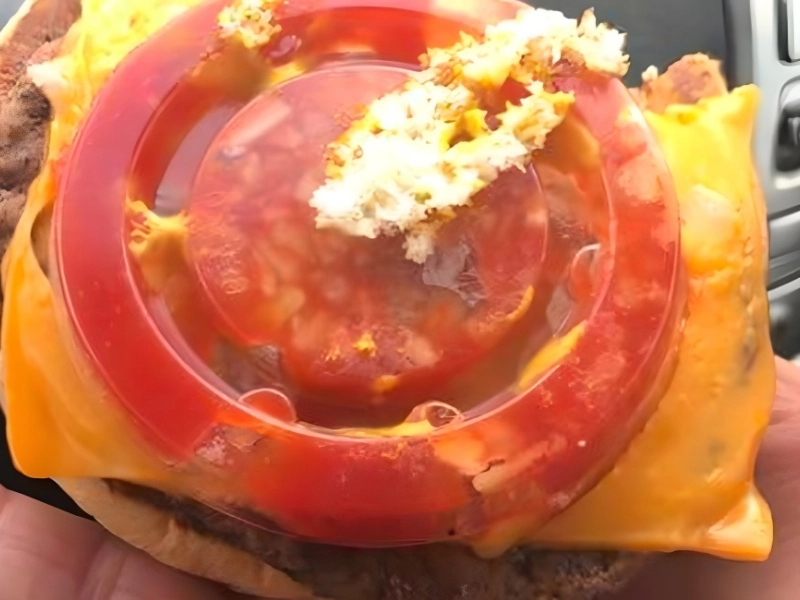 This person was enjoying a regular McDonald’s burger and an ordinary day when they saw something strange and decided to investigate. Everything looked perfect, except for the tomato slice that appeared to be plastic or AI-generated! Ouch!