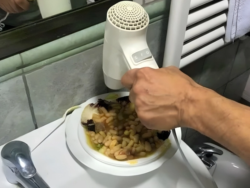 The wisest course of action in such a situation is to avoid going into the restroom, even if you see the waiter go inside with your cold meal and come out with a hot plate. It’s not your fault that the waiter heated your food with a hairdryer; they likely protected their skin by acting in a manner similar to what’s seen in the photo. The mother of invention is need!