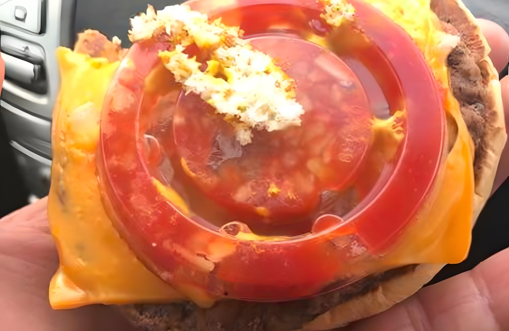 This individual was having a normal day with a typical McDonald’s burger when they noticed something unusual and decided to take a peek into it. Everything seemed great, apart from the tomato slice that seemed to have been AI-generated or made from plastic! Yikes!