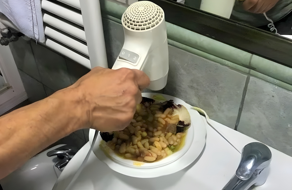 If such a thing unfolds, the best thing to do is to steer clear of the bathroom, even after you witness your waiter enter it with your cold food and come back out with a hot plate. The waiter probably saved their skin by doing something along the lines of what’s happening in the picture, so you cannot blame them for using a hairdryer to heat your food. Need is the mother of invention!