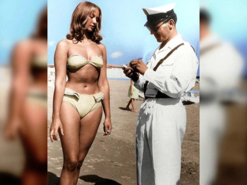 Italy, 1957: A fashionista is fined by a policeman for wearing an overly exposing swimwear. The incident spurred a contentious discussion regarding whether or not swimsuit is suitable in public areas.