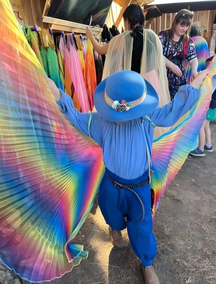 These enormous rainbow wings are loud, to say the least, and they were bought by a woman and her son at a Renaissance fair. Apparently, these two were interested in the idea of looking like a cross between a midlevel court jester and a technicolored parrot. Why settle for a humble monk’s robe when you can blind every onlooker with an array of colors that would even make a peacock slightly jealous? At least, that’s what they would say.
