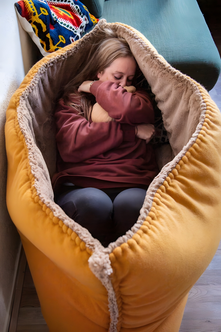 This is called The Floof- and it’s made for human-sized hermiting. After getting this thing, you’ll be quick to hurry inside your brand-new pouch, like a kangaroo in reverse, for a short nap or a few hours of reading. Sure, everyone loves a cozy nook, but this oversized pouch combines comfort with a little bit of unique absurdity, where the two meet for a long, awkward conversation. This mega-pouch says less “cute and cozy” and more “seclusion, please.”