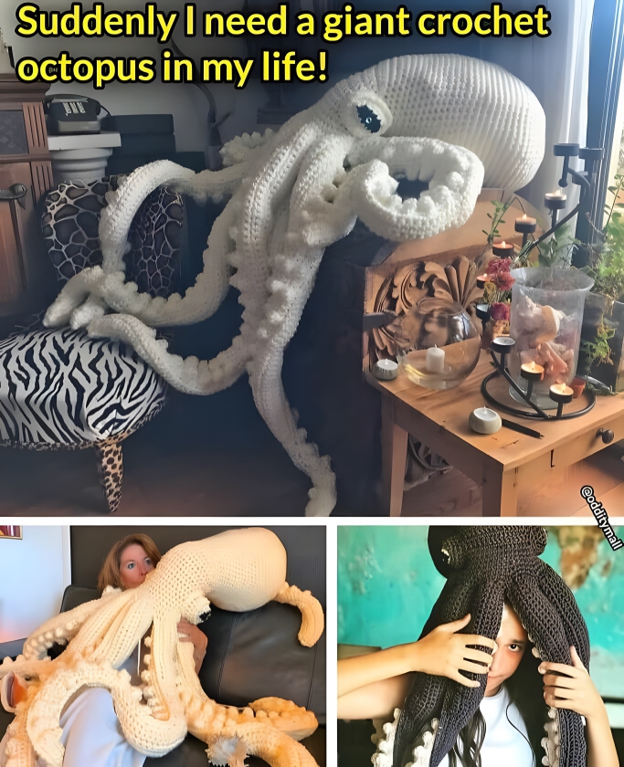 Step right up and admire a mess of yarn that has infiltrated deep-sea lovers’ living rooms. It’s an octopus, now supersized to the point where it matches up to a small car. It’s got eight floppy tentacles that appear to be more than a tripping hazard than a decorative feature. But hey, if you’ve ever dreamed of being engulfed by a giant woolen sea creature- this might be your lucky day.