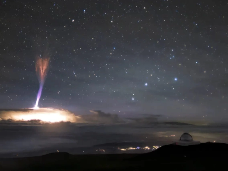Although blue jets are not red itself, they are strongly associated with red lightning events and frequently coexist with them. Rising from the summits of thunderclouds, these little, cone-shaped bursts of blue light reach stratosphere heights of up to 50 km. Given only a few tenths of a second, blue jets are even more elusive than red sprites.
