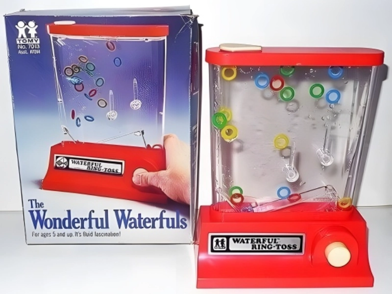 A wonder of simplicity, the Waterful Ring-Toss game enthralled us in ways modern children might find difficult to understand. Long road trips, doctor’s waiting rooms, and those dull visits to relatives all included this portable water game as a mainstay. The idea was simple: move floating rings onto a set of pegs using the water pressure created by button pushing. Oh, the difficulty it presented, though!