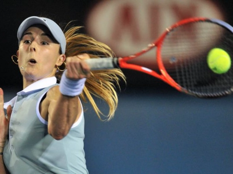 Parece dispuesta a golpear a su oponente con la raqueta.