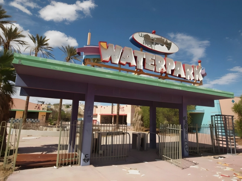In San Bernardino, California, the Rock-a-Hula Waterpark was established in the 1960s. Originally designed to resemble a carnival oasis, it now serves as a stark reminder of why it is a horrible idea to build a waterpark in the middle of a desert. The 1960s and 1970s were prosperous times for Rock-a-Hula, but the 1980s saw a decline in attendance. At last, Rock-a-Hula closed its doors in 1990.