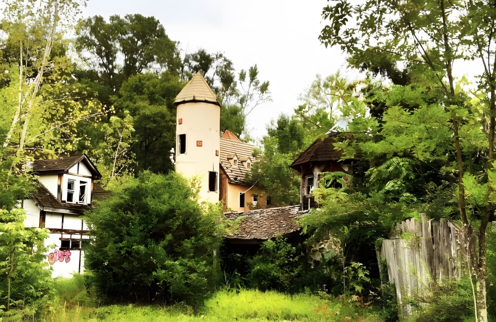 Alas, the Faire had several bad seasons with no profits and few attendees, so it was forced to abandon its Medieval town in the woods. Now, the eerie buildings look like a random time warp amid the green woods, and people do visit now, though only to explore these lonesome structures.