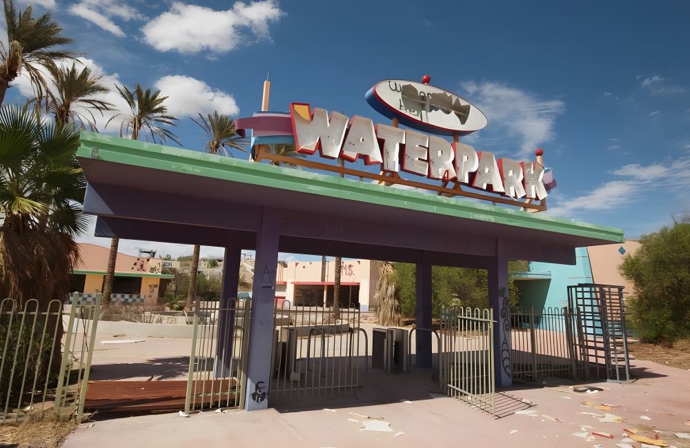 In the 1960s, the Rock-a-Hula Waterpark was founded in San Bernardino, California. It was intended as a carnival-like oasis, but, now, it is just a reminder of why putting a waterpark in the middle of the desert is a bad idea. Rock-a-Hula did well during the 1960s and 1970s, but attendance dwindled in the 1980s. Finally, in 1990, Rock-a-Hula closed.