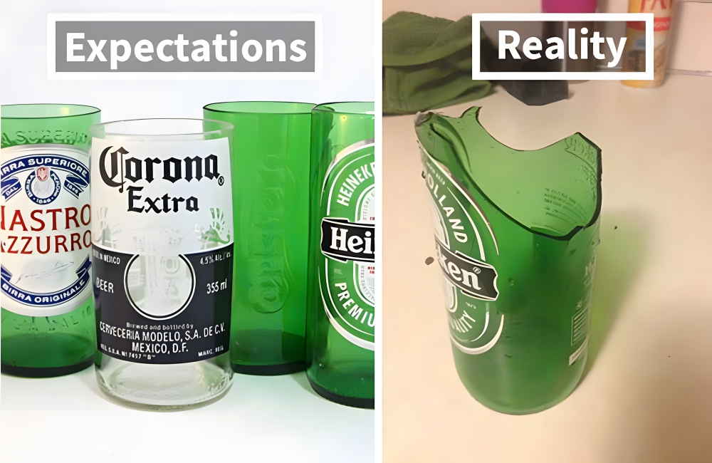 One person saw a DIY project where beer bottles were recycled into washable glasses. The glass was likely precision-cut and sanded down with the help of expensive power tools. As the attempted copycat found, just breaking a bottle in half does not a glass make.