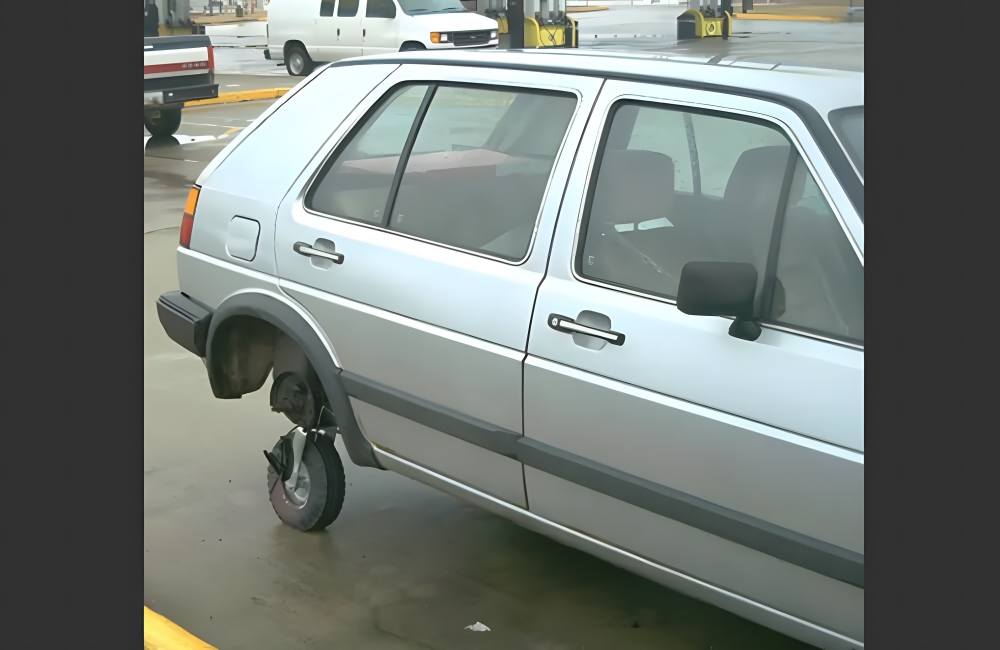 Not only has this person managed to write off an entire wheel, but they’ve also chopped up a perfectly decent cart too, creating double the financial damage. Plus, at some point a new wheel is going to have to go on there, costing at least another $100.