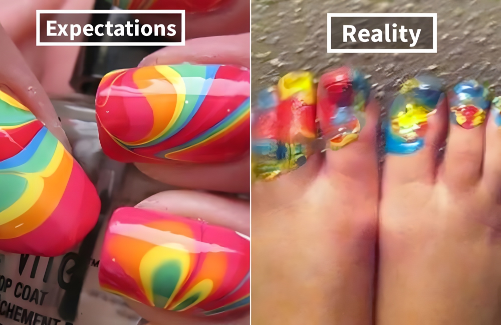 What happened here? Did a toddler run wild on those tootsies, or was this a genuine effort that quickly went sour? It just goes to show that amateurs should never go where experienced nail techs fear to tread. It’s never going to turn out well.