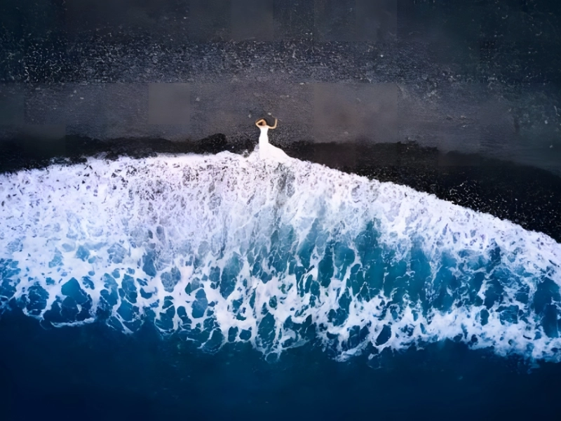 Disney’s Little Mermaid pales in comparison to this amazing drone image that achieves a metaphysical synthesis of nature and humankind. The concept of this picture is simple: a woman wearing a white gown lies on the beach’s edge, watching the foamy waves of the ocean come closer to her.