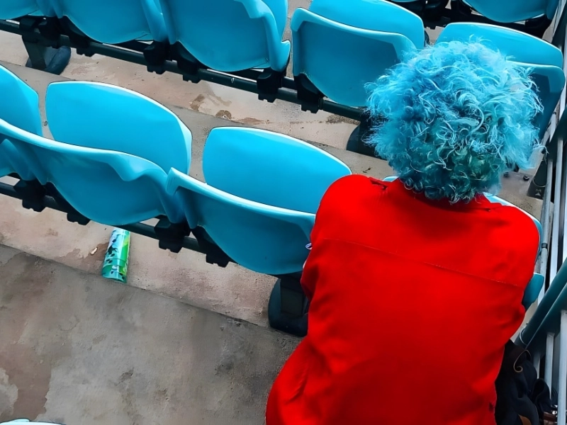 The subject’s red shirt stands out against the background as a strong contrast, adding an extra touch of edge to the otherwise flat photo. Nothing particularly noteworthy is shown in the photo; instead, the framing and color balance give it an unusual and distinctive look.