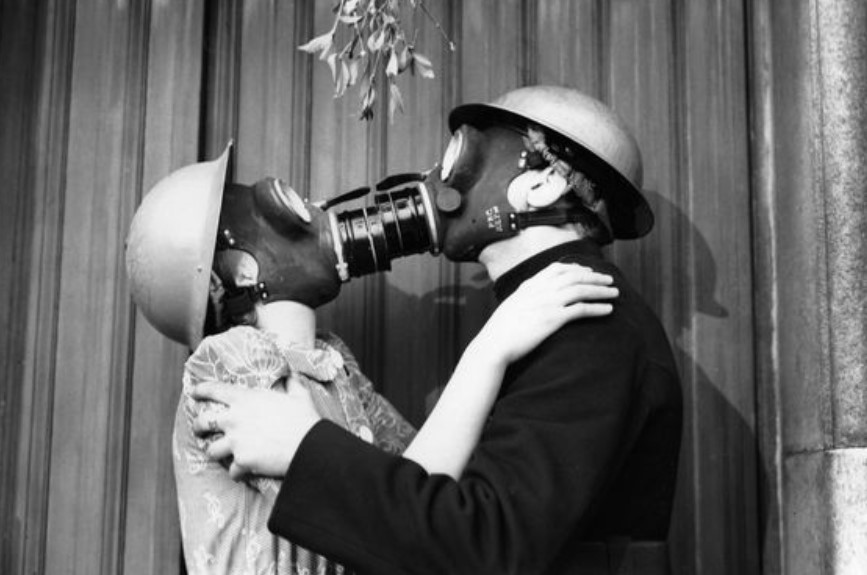 A kiss in gas masks is quite romantic.