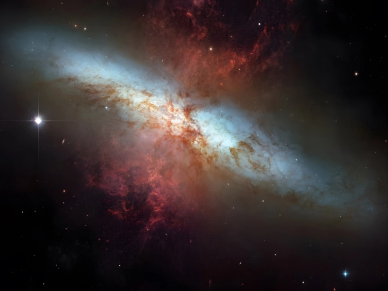 Brightly glowing at infrared wavelengths, M82, also called the Cigar galaxy, is notable for its star production activity.The closest galaxy, M81, and the Cigar galaxy interact gravitationally, leading to a starburst that can best be defined as an unusually rapid rate of star production.