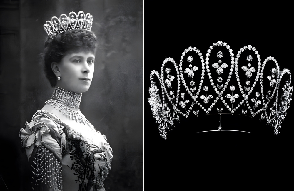 When she returned home, she immediately commissioned several pieces, including a Loop Tiara from Boucheron. The tiara is noted for its striking diamond loops, which are separated by motifs. The overall look is of a floating tiara. The Boucheron Loop Tiara was dismantled in 1911 to make the Delhi Durbar Tiara.