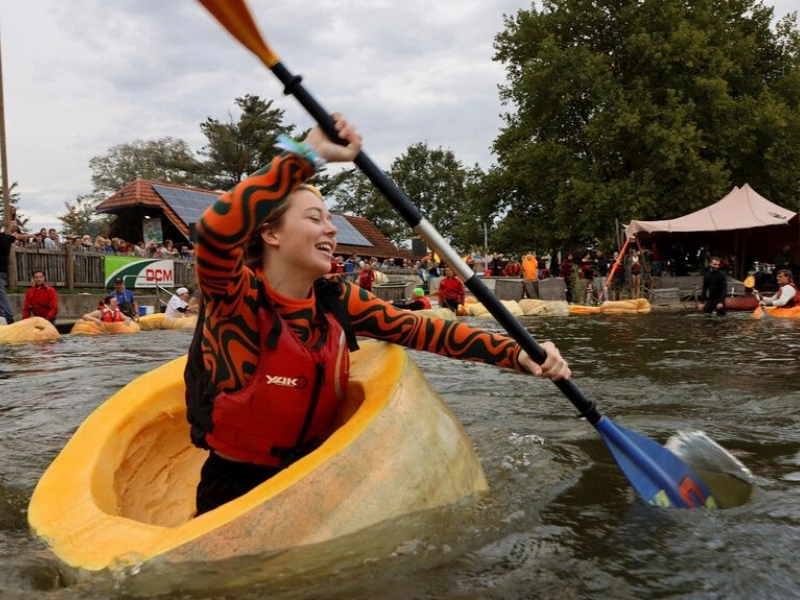 Pumpkin racing began in 2008 as a way for local farmers to find inventive ways to employ their enormous pumpkins—some weighing over 400 kg—for competition. Locals claim that it is now harder to obtain a suitable pumpkin for building a kayak because they can now weigh up to 1000 kg, which is too heavy for them to float. Pumpkin kayaks are difficult to control because, when paddling, they have a tendency to spin around their own axis rather than move ahead, according to participants.