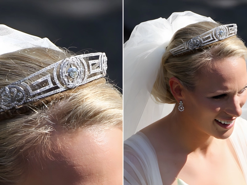 Zara Tindall, the only daughter of Princess Anne and the eldest granddaughter of Queen Elizabeth II, wore this Cartier design on her wedding day. Greek Key tiara from her mother Princess Anne’s collection; it was manufactured in the early 1900s.