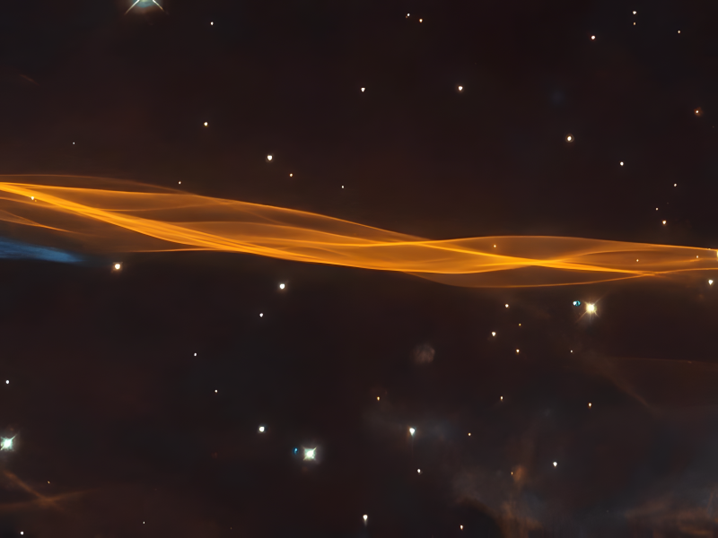 The Hubble Space Telescope discovered this minute portion of the Cygnus supernova blast wave, which appears as a delicate streak of light. The blast came from a supernova explosion that was over 2,400 light-years away and tore apart a dying star that was 20 times as massive as the Sun.