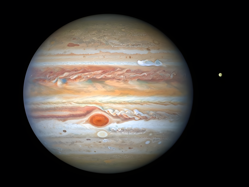 The Hubble Space Telescope’s close-up photograph gives experts a new look at Jupiter’s dramatic weather patterns. A lengthy, white storm with winds of roughly 560 km/h can be seen in the north. Europa, the gas giant’s icy moon, is located to its left.