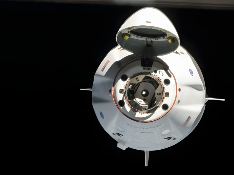 SpaceX launched Crew Dragon Demo-2, its first crewed flight, to the ISS on.The first astronauts to launch from American territory since 2011 were NASA astronauts Robert Behnken and Douglas Hurley. The spacecraft’s docking system, which enables it to attach to the Harmony module’s front International Docking Adapter, is visible in the nose cone of the image.