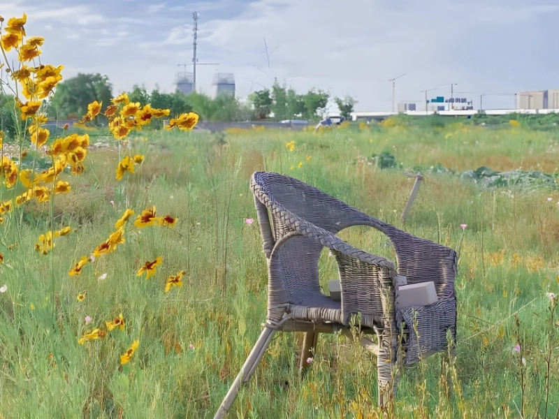 There is more going on in this picture than first meets the eye, giving it an almost surreal appearance. It appears to be a typical natural setting at first, with vibrant yellow flowers and green and brown grass all around. Subsequently, upon closer inspection, you will discover that the wicker chair is not as charming as you had initially believed and is actually broken.
