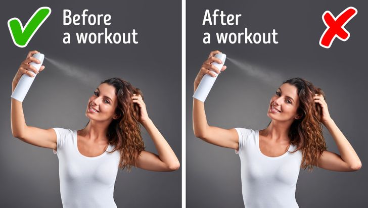 It’s rather useless to use dry shampoo after a workout: the hair becomes so greasy that we can do nothing with it. You’d better apply dry shampoo before exercises so that it can absorb all of the sweat during a workout.