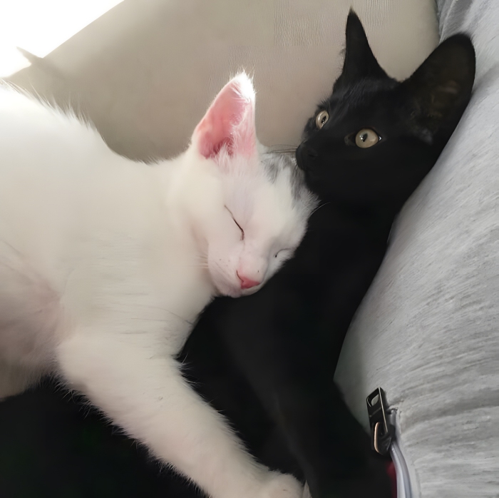 Let’s hope that this black cat learns to love physical touch as time goes on because it looks as though his new sister doesn’t want to stop cuddling anytime soon!