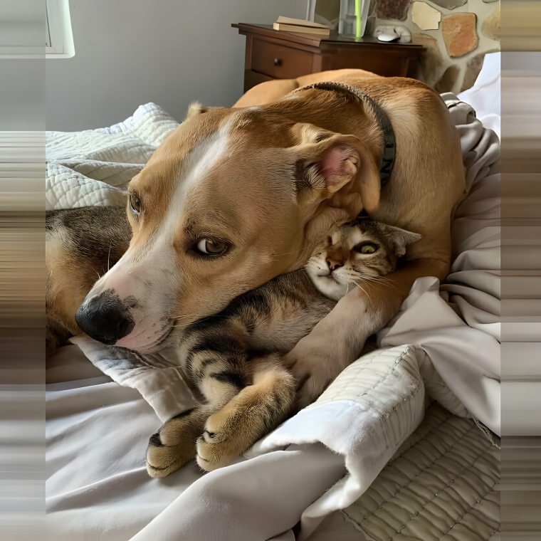 Cats and dogs are very different when it comes to their physical affection needs. While dogs could snuggle all day, cats love a snuggle while also having the ability to go off and have their own space. But what happens when you put these two pets together? Well, you end up with a situation like this. Although the dog looks pretty content, the cat looks as though it’s going to snap at any minute.