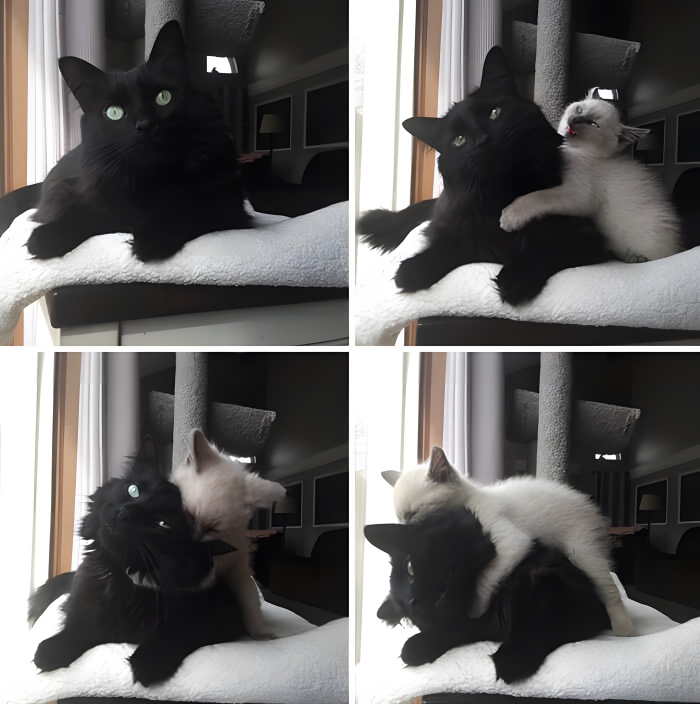 Many people adopt animals from animal shelters, but that’s not the only way to rescue a pet. When the kitten in this picture showed up on the porch of this family’s house, the humans didn’t know what to do. In the end, they decided to keep him – despite their worries that the new kitten would struggle to get along with the other cats in the house. But as you can see, the older cat is tolerating him!