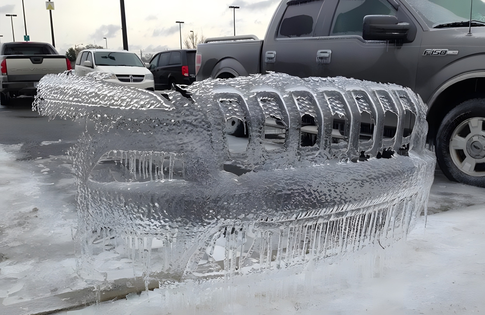 Ice formed on a Jeep before the Jeep pulled away, leaving it hanging in place like it’s suspended by some kind of invisible force. This is the kind of picture you take and send to everyone in your office on your lunch break.