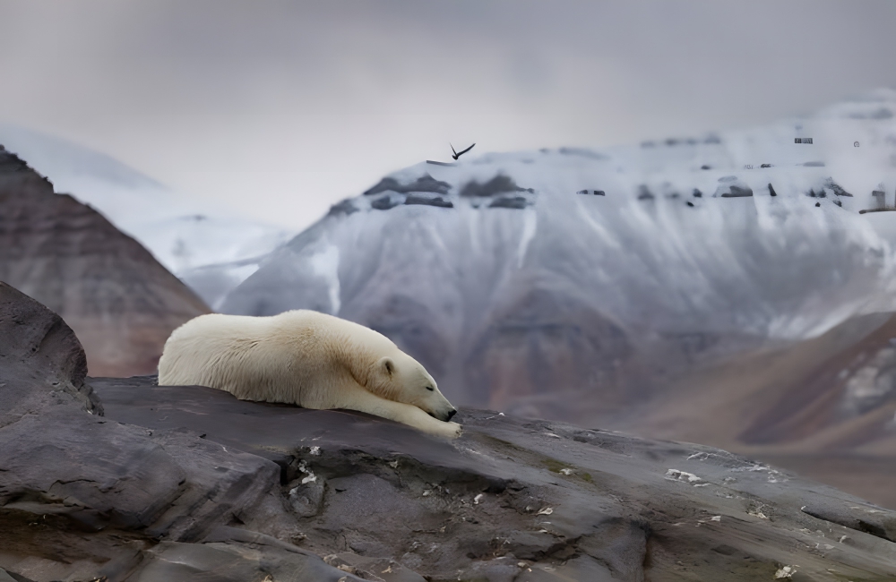 He quickly whipped out his camera – likely something similar to a Canon Rebel T7i – and captured the moment. He told Insider, “I wanted to contrast his snow-less bed with the snowy mountains behind him that reflect the global-warming crisis.” The resulting photo was nothing short of genius.