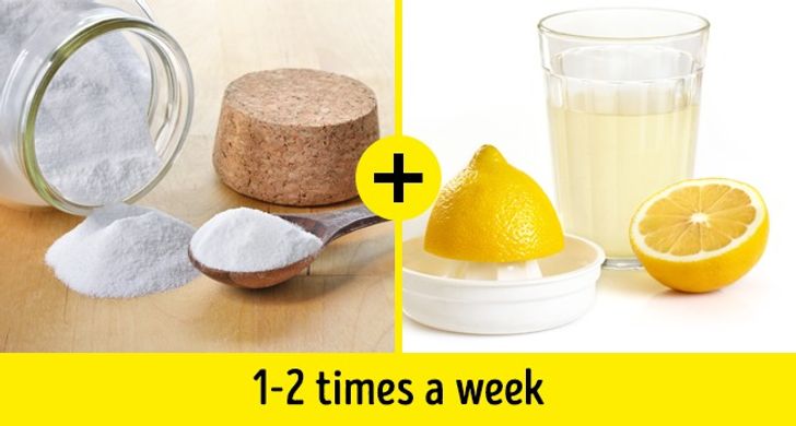 Put a pinch of baking soda on your toothbrush, and add a few drops of lemon juice over it to get a set of shining teeth. Remember not to use this whitening method more frequently than once a week.