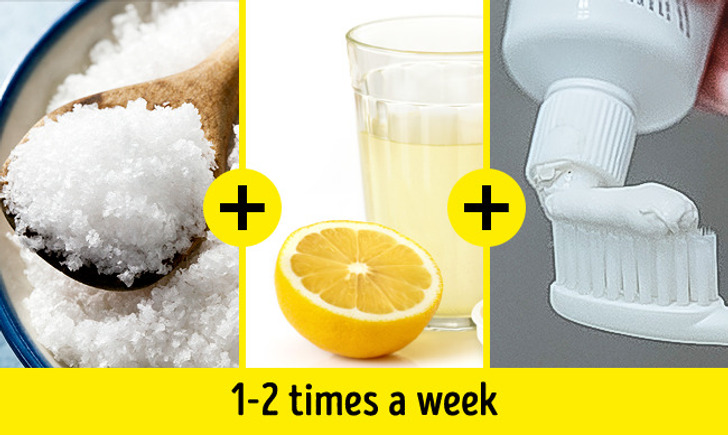 Mix a tablespoon of toothpaste, a pinch of salt, a bit of baking soda, and 4-5 drops of lemon juice in a bowl. Brush your teeth with this mixture for 4-5 minutes. You’ll see the difference after just one use. Use this method once every 2 months.