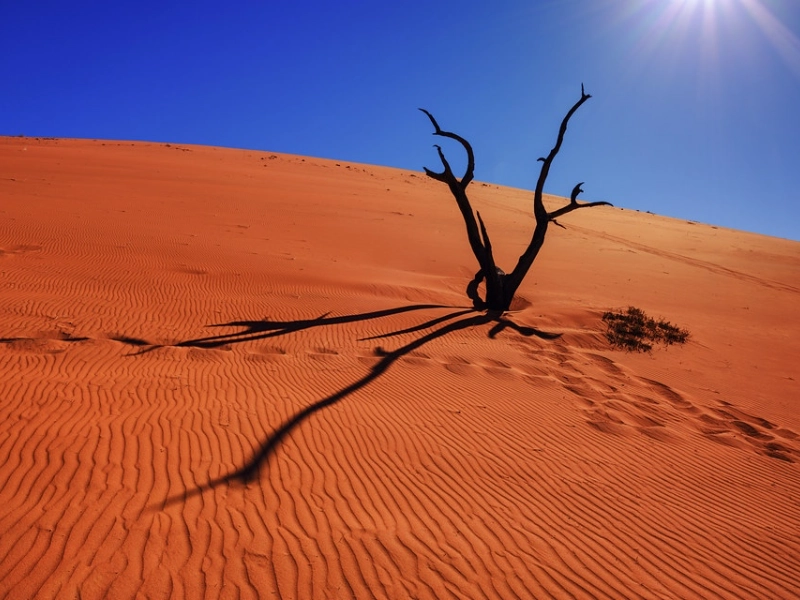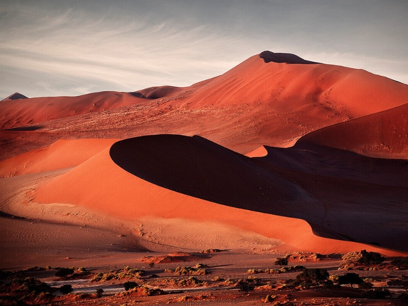 Namibia’s Red Desert wakes in early summer grandeur as the calendar turns to November. This time marks the start of an amazing visual feast as the desert scene explodes in its most vivid annual show. These months’ strong sunlight highlights the dunes and turns them into a sea of rich, deep crimson as far as the eye can see. With each dune producing lengthy, dramatic shadows that alter with the day, the contrast between the flaming red sands and the crystal-clear blue heavens makes a photographer’s dream come true.