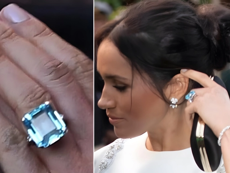 Meghan Markle @Pistol Patty (Patty Davis) / Pinterest | @hrhofsussex / Instagram.com Princess Diana’s Emerald Cut Aquamarine Ring